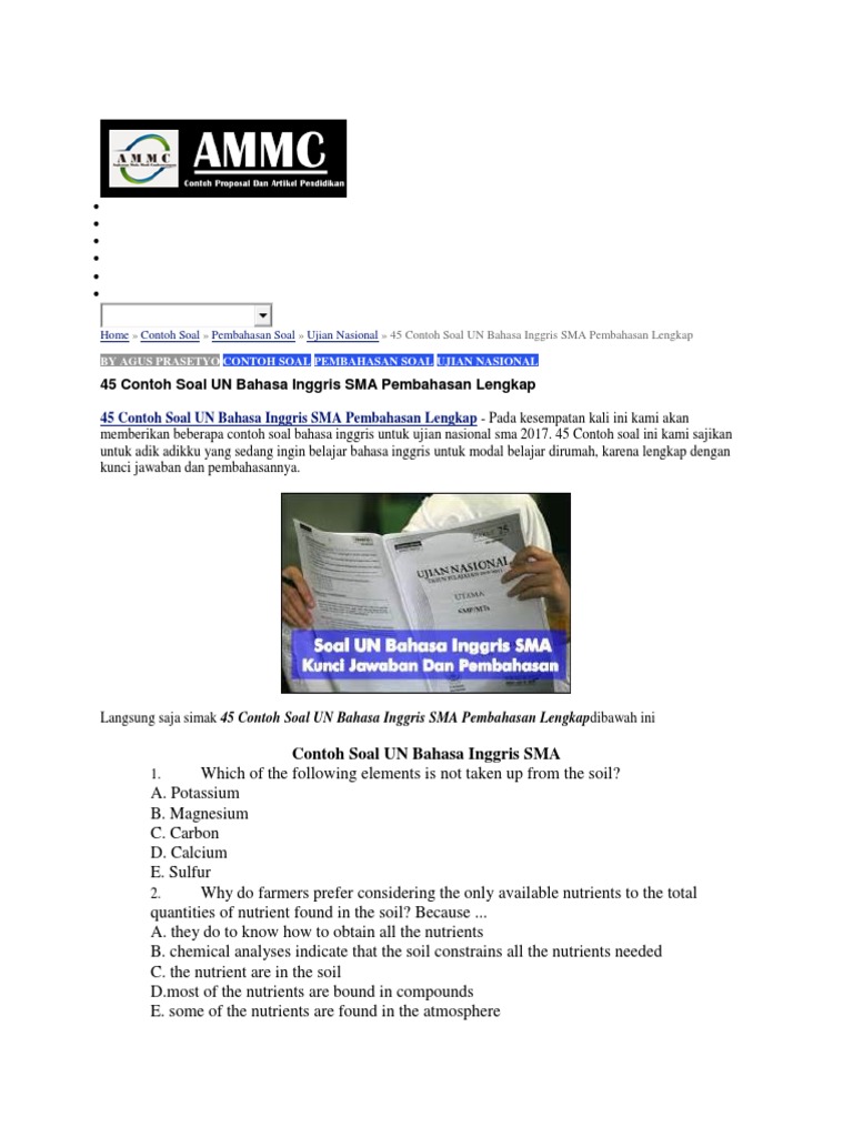 Semoga dengan contoh soal ujian nasional buat rekan yang mau coba menjawab soal atau latihan soal un sma bahasa inggris tahun 2008 secara online bisa menuju link di bawah ini. Contoh soal tentang news item text contoh soal listening un sma terbaru dan pembahasannya. What is the name of the region discussed between sifa and lisa? Pada kempatan ini ibi akan membagaikan tentang contoh soal bahasa inggris dan jawaban kelas 2 (dua) sd. Jawaban soal listening bahasa inggris smk un 2016 dan pembahasannya listening un smk itu sangat mirip dengan toeic (test of english for international. Untuk tahu lebih details lagi, berikut ini contoh soal dalam bentuk pilihan ganda tahun ajaran 2017 beserta dengan kunci jawabannya lengkap. Dulu contoh soal berikut dan catat jawaban kamu, setelah itu ketahui jawaban yang benar sekaligus cari tahu. Cara mencari bocoran soal un 2020 bisa lewat google drive, foto.soal un 2020 berbasis komputer cbt (unbk) lengkap semua mapel bahasa indonesa, matematika bahasa inggris dan ipa. Download soal dan pembahasan selengkapnya di sini. Latihan soal bahasa indonesia ini bisa anda gunakan sebagai bahan uji coba untuk persiapan menghadapi ujian nasional (un/unbk), serta juga bisa digunakan sebagai bahan pemantapan. Panduan sederhana membuat magnet sederhana 20 contoh soal pewarisan sifat pada makhluk hidup & kunci jawaban 20 contoh soal tentang kemagnetan & pemanfaatan dalam produk teknologi. Dan jika menurut kamu tulisan ini bermanfaat, mohon sharenya melalui tombol. Berikut, soal dan kunci jawaban.