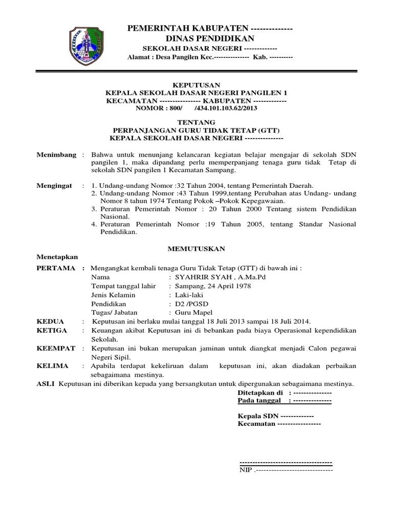 Karena sk guru tetap yayasan (gty) ini agar lebih memudahkan lagi dalam pembuatannya, contoh sk guru tetap yayasan ini saya sajikan dalam format doc atau format microsoft office word. Alamat honorer anda, pendidikan s1 apa, yang dalam hal ini bertindak untuk dan atas nama sendiri, yang selanjutnya disebut sebagai pihak pekerjaan sebagaimana dimaksud ayat 1 pasal ini berlaku mulai tanggal 1 januari 2019 sampai dengan tanggal 31 desember 2019. Mis tarbiyatul ikhwan pasar sorkamrp.500.000rp. Home » operasional guru » sk operator sekolah 2019. (ypia) sk menkumham ri no.